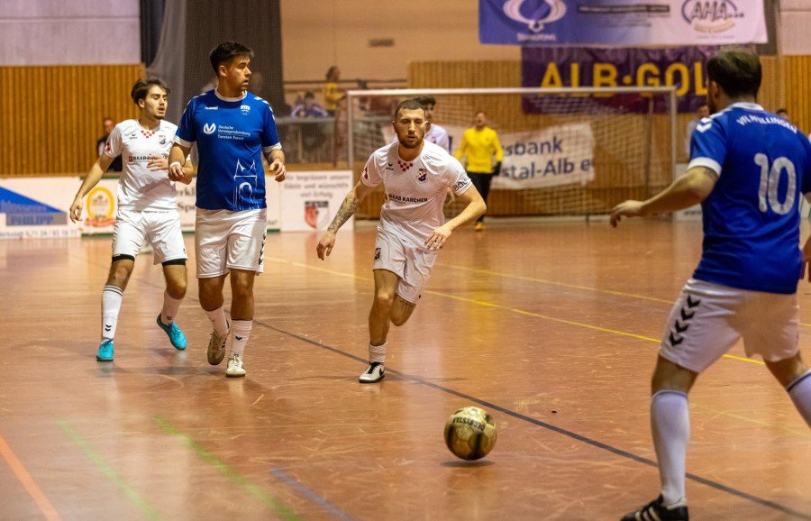 Spielszene aus dem Halbfinale des Volksbank Ermstal-Alb Cups 2025. Der spätere Turniersieger VfL Pfullingen II aus der Bezirksliga Alb behält gegen den Landesligisten SV Croatia Reutlingen die Oberhand... Foto: R.Dvorak R3D